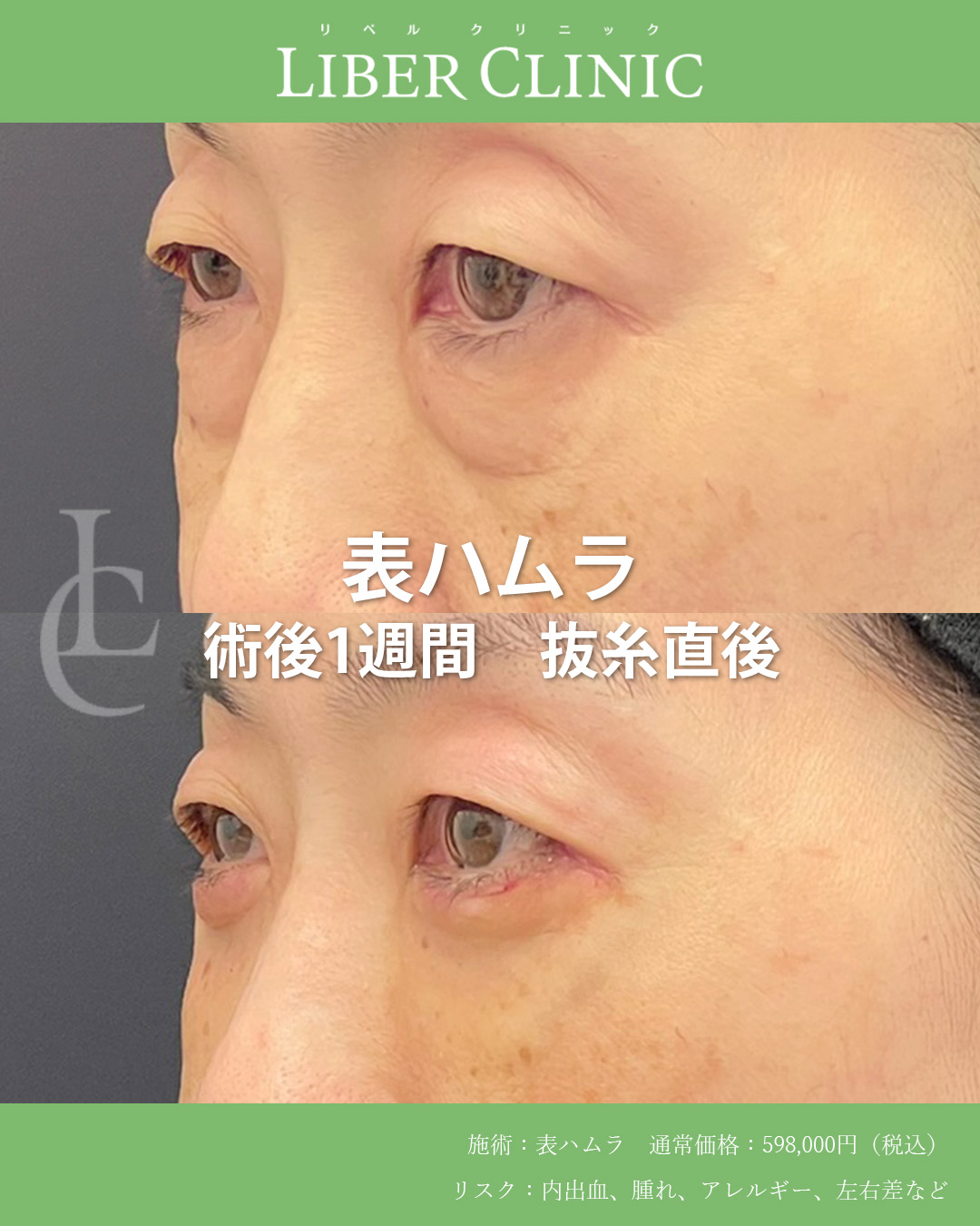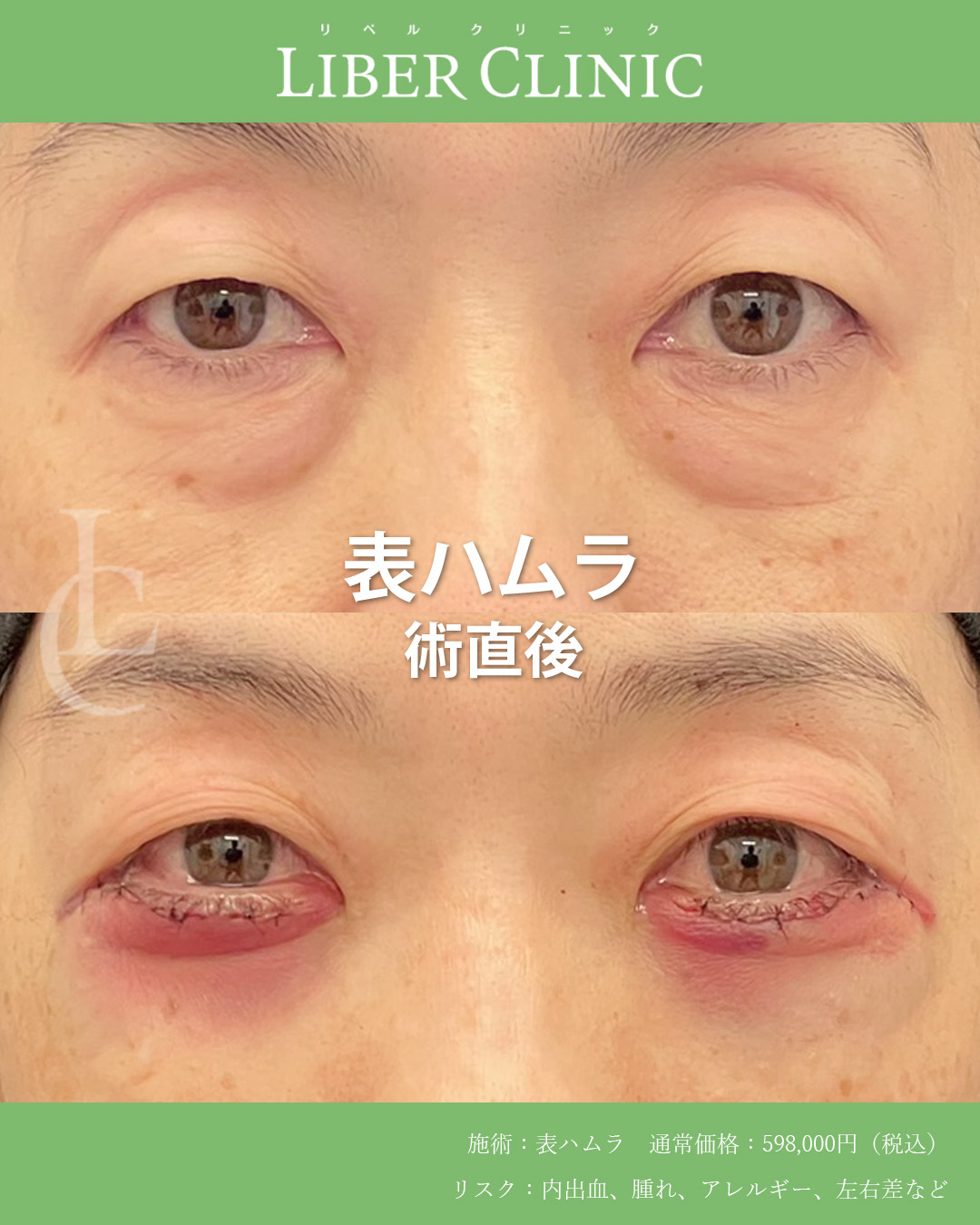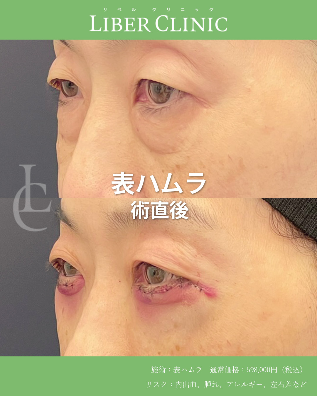 表ハムラは皮膚を切開しつつ、クマの原因であるティアトラフを剥離し、その隙間に膨らみの原因である眼窩脂肪を固定してクマを改善する術式です。